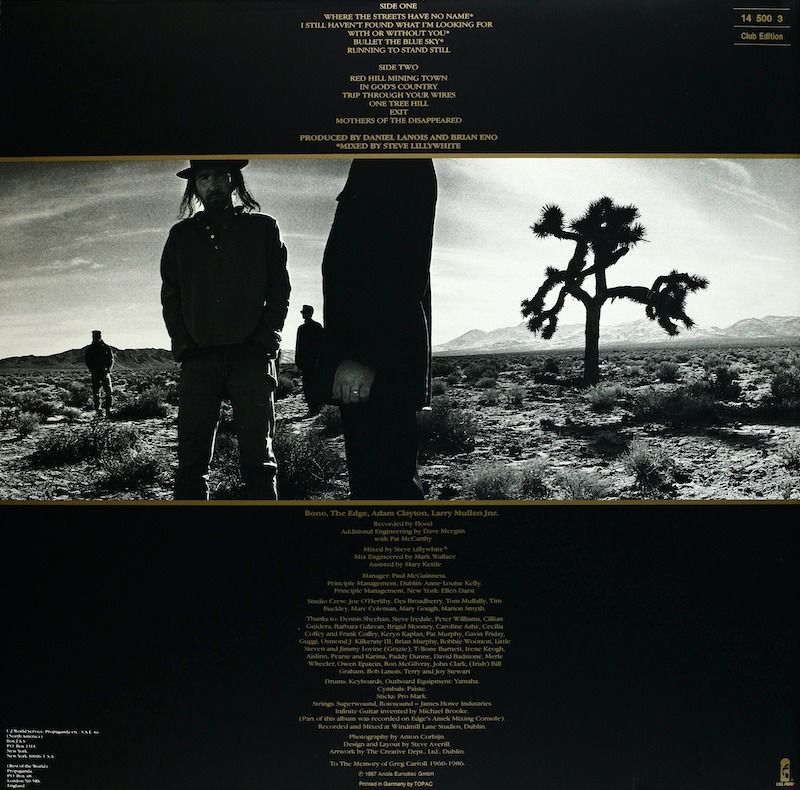 Si tratta però di un successo non ancora compiuto a pieno: nonostante sia ormai conosciuta e apprezzata in tutto il mondo, la missione della band irlandese è quella di creare un linguaggio musicale che sia realmente universale e trascinante. L’esperienza del Live Aid, il tour “A Conspiracy Of Hope” per Amnesty International, il supporto a Greenpeace, i tanti viaggi di Bono tra Stati Uniti, Africa e Centro-America conferiscono agli U2 la piena consapevolezza delle responsabilità di una celebrità sempre più ampia e fanno da sfondo alla scrittura di quello che, già nelle intenzioni, voleva essere una pietra miliare del rock mondiale. Con “The Joshua Tree”, che esce il 9 marzo 1987 su Island Records, gli U2 sognano una dimensione artistica nuova, una via intermedia che sappia unire la tradizione irlandese all’enormità delle possibilità americane. Il titolo, che in origine doveva essere “Desert Songs”, si rifà infatti all’albero di Giosuè, un cactus gigante che cresce nella Death Valley, ribattezzato così dai primi mormoni giunti in America. Nella foto di copertina – realizzata da Anton Corbijn totalmente in bianco e nero, così come sulle stesse tonalità si sviluppa il booklet originale – gli U2 si fanno ritrarre senza particolare espressività lungo la Route 190, che in California costeggia proprio la Death Valley. È evidente la portata spirituale di tale scelta: gli U2 intraprendono un pellegrinaggio trionfale verso la Terra Promessa del rock, ne captano l’immensa energia dandone una forma unica, sintesi vincente di stupore giovanile e consapevolezza adulta.