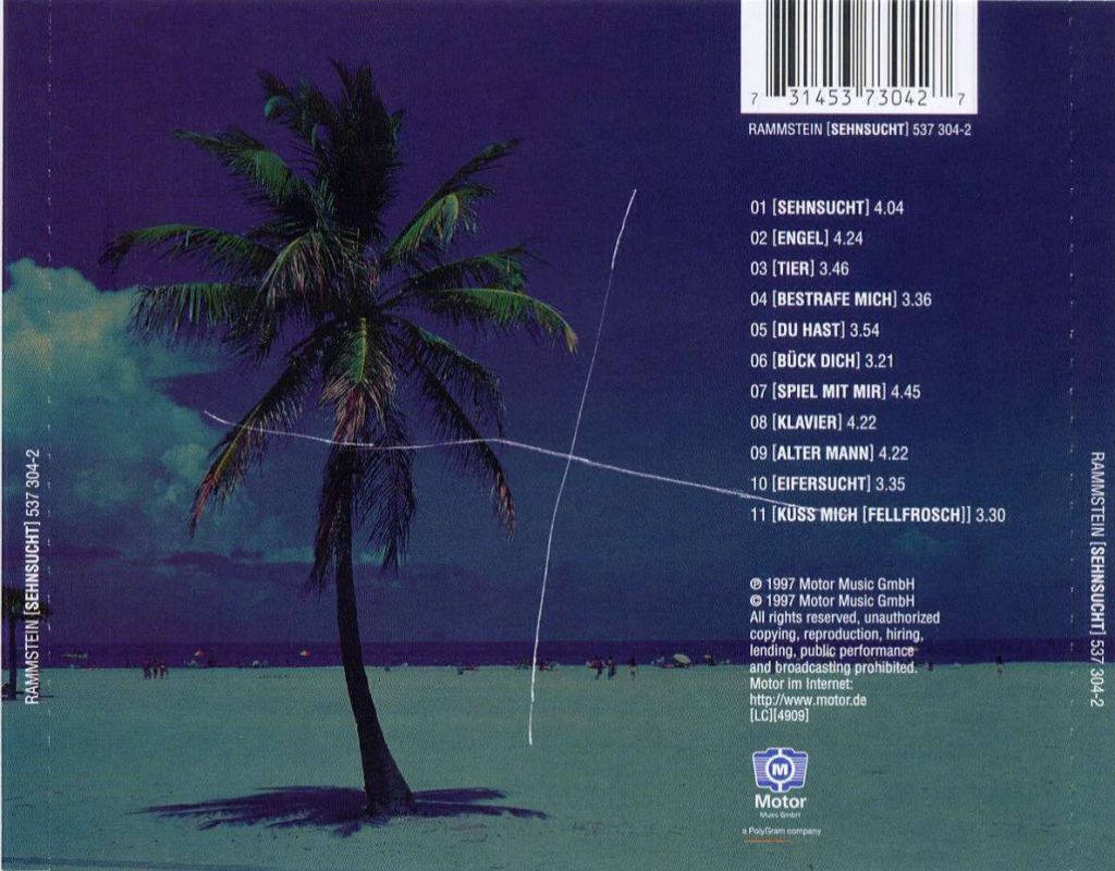 Insomma, “Sehnsucht” è un album/caleidoscopio di significati e significanti, che di univoco ha solo l’assurda monotonia di ogni singolo brano, che porta allo sfinimento con il suo infinito ripetersi di segmenti chitarristici e ritmiche da dance floor infernale. L’artwork stesso, ad opera dell’artista visuale Gottfried Helnwein, è un gioiello in tal senso. Nel libretto i membri della band sono ritratti addobbati da ferraglia assortita e presentano una pelle cerulea che fa pensare a sei cadaveri imbellettati per una mostra macabra inneggiante al post-mortem, mentre sul retro troviamo una spiaggia immortalata con tinte scure che, seppur nel gelo che l’ammanta, non manca di cozzare col resto del libretto.