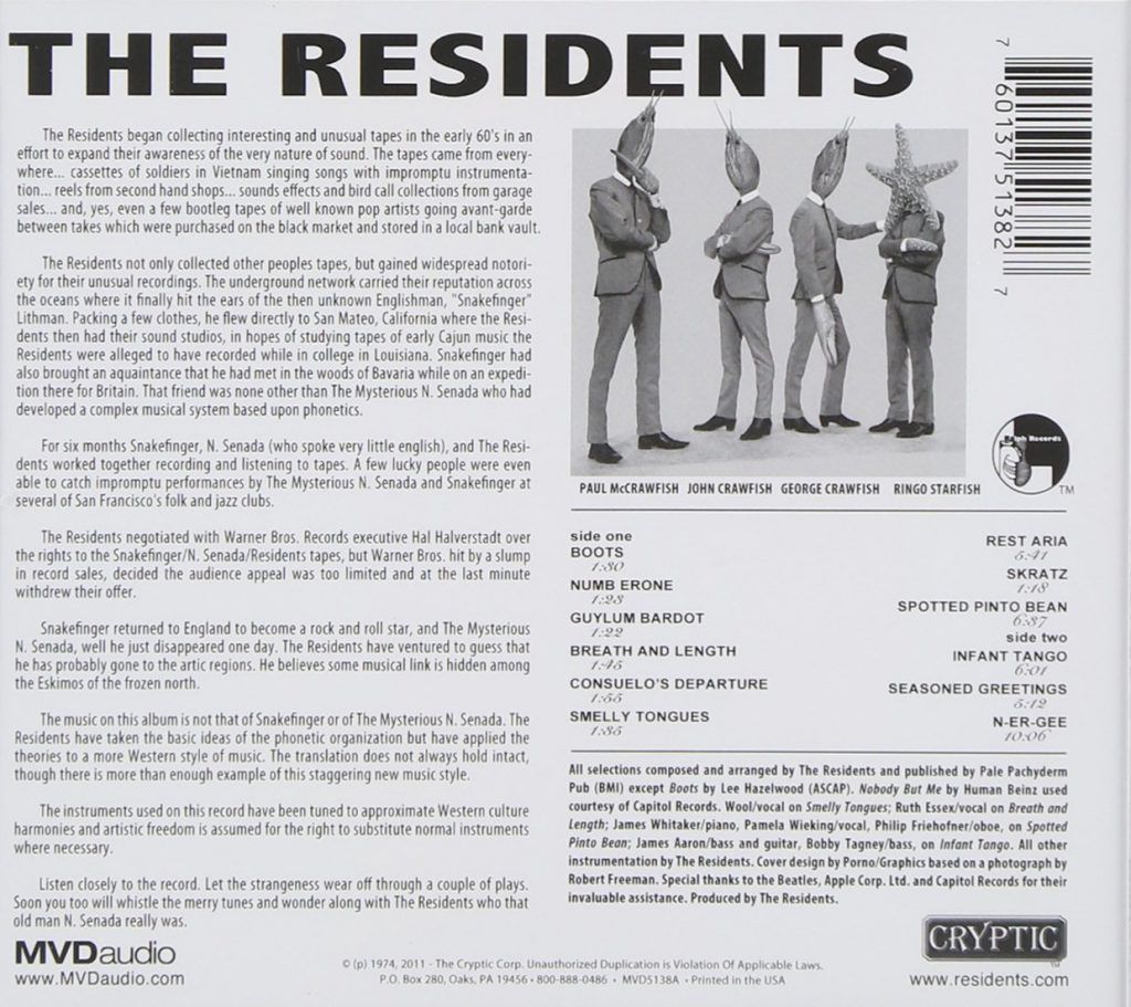 I Residents creano un mondo parallelo dove la cultura pop, la musica, il folklore diventano un blob indistinto, confuso e manipolabile secondo la loro volontà. Non si può parlare di psichedelia, proto-punk, jazz, progressive; ogni cosa perde il suo valore, la sua unicità e viene costantemente rimescolata, con uno sprito tra il naif e il Dada nel quale l’unico punto di interesse è l’espressione pura, una musica che rifiuta il musicista.