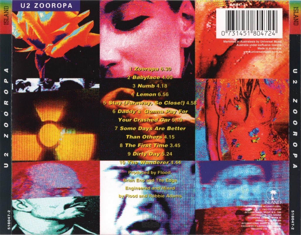 In “Zooropa” ci sono grandi canzoni come Stay, senza dubbio una delle loro più belle di sempre e pezzi di forte rottura come Daddy’s Gonna Pay For Your Crashed Car. Pezzi che strizzano l’occhio ai dance floor come Lemon e pezzi sperimentali come la title track Zooropa passando per ballad dolcissime come The First Time che più di tutte si ricollegava a dischi del periodo pre-scisma e Dirty Day, pezzo che ben combinava sonorità rock a sperimentazioni elettroniche.