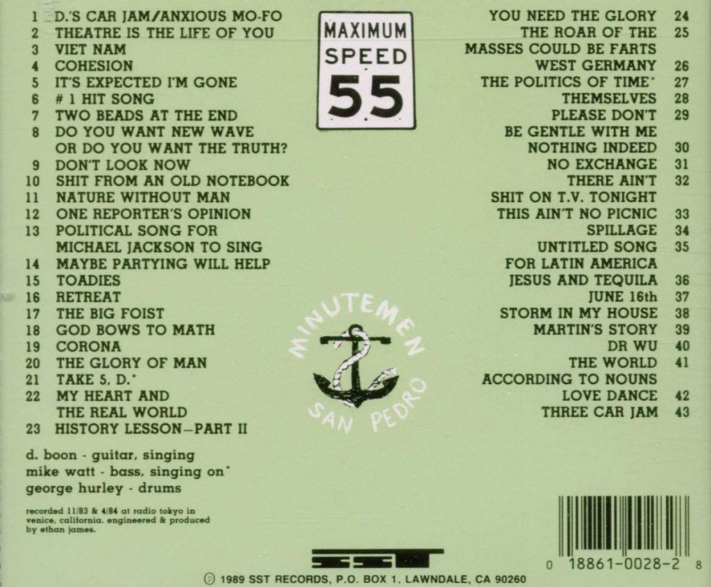 Il nome nasce come reazione ad una canzone di Sammy Hagar, I can’t drive 55, una protesta contro il limite di velocità di 55 mph imposto dagli USA su tutte le loro autostrade. Non un qualcosa di sconvolgente secondo Mike Watt, sono più che felicio di mettermi a 55 mph in auto, tanto faccio musica pazza, questa è la mia ribellione. Come gli album che più porto nel cuore (ad esempio i prima citati cLOUDDEAD), lo stile dei Minutemen è quanto di più singolare sia esistito in territorio “punk”. Punk tra virgolette, perché ha poco a che fare con il punk comunemente inteso (Sex Pistols, Ramones) così come con quella storica sotto-categoria alla quale dovrebbe appartenere, l’hardcore-punk. Ascoltando “Double Nickels On The Dime” lo mettereste a paragone con i Black Flag o i Dead Kennedys? Io personalmente no e per questo “Double Nickels On The Dime” è una delle migliori rappresentazioni non del punk come musica ma come idea.