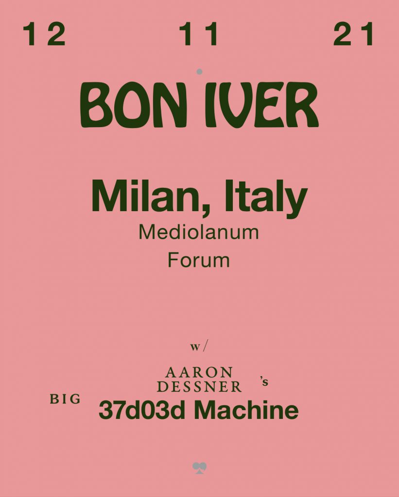 Inizialmente prevista per il 9 novembre 2020 al Mediolanum Forum di Milano, l’unica data in Italia del tour europeo dei Bon Iver, è stata posticipata di un anno, così come tutte le altre date della tranche continentale.