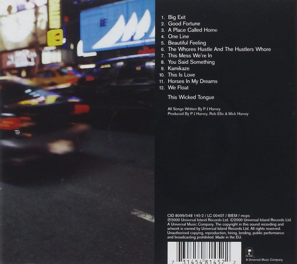 “Stories from the City, Stories from the Sea” era un album piuttosto melodico e brillante, con liriche più semplici e dirette che rimpiazzavano le allusioni e le metafore dei dischi precedenti. L’atmosfera generale sembrava una reazione all’infelicità dei momenti passati. Il suono grandiosamente rock’n’roll di Big Exit e di Good Fortune, messe all’inizio, sembrava uscire fuori da uno dei primi dischi dei Pretenders, e altrove c’erano languide ballate che svelavano il lato più romantico di PJ Harvey. In qualche maniera nell’album era capitato pure Thom Yorke dei Radiohead, che si prendeva il microfono per la lussureggiante This Mess We’re In e si spendeva ai cori in un altro paio di canzoni. I nervi scoperti delle frustazioni urlate nei dischi precedenti erano ora ammantati da una patina di apparente tranquillità e ne venivano fuori canzoni intime e sussurate (Horses In My Dreams), persino riflessive (A Place Called Home) o appena più tormentate (One Line), e solo poche volte PJ perdeva veramente il controllo (Kamikaze e This Is Love). L’album si chiudeva con la spiazzante bizzarrìa lounge di We Float, un pezzo che sembrava arrivare da un altro pianeta rispetto a quanto fatto da PJ fino a quel momento.