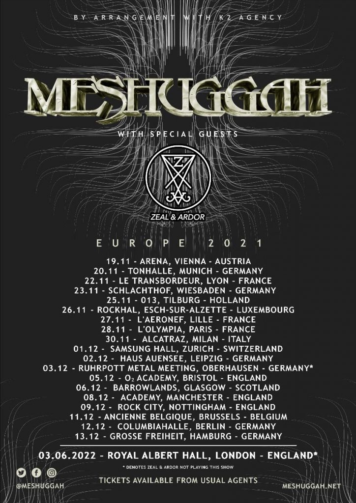 I Meshuggah guardano oltre il terribile anno appena trascorso e organizzano un tour europeo che, ovviamente, passerà anche per il nostro Paese. La band di Umeå si esibirà il 30 novembre 2021 all’Alcatraz di Milano. In apertura Zeal & Ardor.