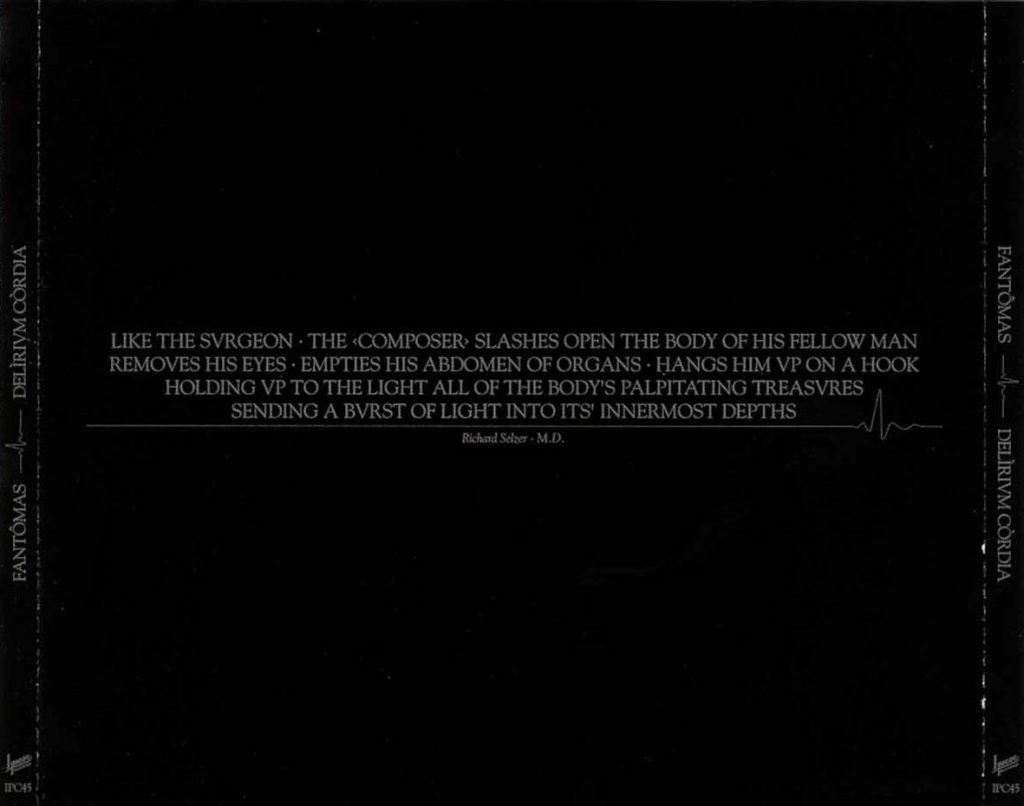 Appena acquistato, “Delìrivm Còrdia” lasciava presagire, già solo dal packaging, qualcosa di terrificante, persino di più di quanto sciorinato finora da Mike, Buzz, Trevor e Dave, una “entità mala” (ma allora è un vizio!). Sfilata la sovracopertina buia e nera come la notte e visionato il chirurgo con le mani guantate sul petto, il dubbio: “Non è che ci han messo dentro un album dei Carcass?” Oh, beh, nel caso, ben venga. Ma no, no, che dico. Messo su il disco le perplessità vengono fugate, ma il libretto pare orbitare proprio dalle parti del grindcore più luridazzo, e anche questa non è una gran sorpresa, dati i precedenti e l’ormai consolidata collaborazione con Mastro Zorn, avido fruitore death, grind e gore. Ma quella che prima era solo musica, ora sono anche immagini, foto inadatte ai deboli di stomaco, tratte dal libro “The Sacred Heart” di Max Aguilera-Hellweg.