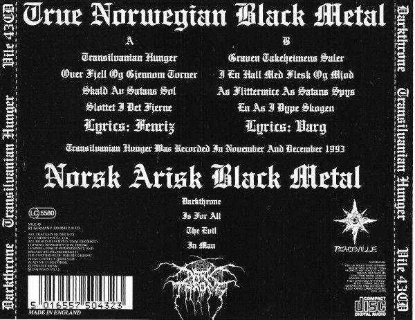 Questo sarà infatti (almeno fino al ritorno in etichetta del 2006) l’ultimo disco dei Darkthrone per Peaceville, che mal digerirà le polemiche scatenatesi da quel “Norsk Arisk Black Metal” (che la stessa band anni dopo considererà come un errore di gioventù) stampato sul retro sulla prima stampa e che verrà successivamente rimosso.