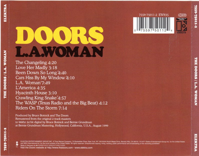 La maggior parte dei pezzi furono registrati in presa diretta, escluse alcune parti di tastiera sovraincise. Il disco fu ultimato in poche settimane. Probabilmente i pezzi più rappresentativi dell’album col tempo sono diventati la lunga title-track, “L.A. Woman” (che celebra il glamour di Los Angeles) Love Her Madly, la stupenda Riders On The Storm, The Changeling e L’America, che, con questi, conquistarono l’ottavo disco d’oro consecutivo che successivamente diventò di platino, ed entrarono nella storia come prima rock’n roll band statunitense capace di produrre 8 dischi d’oro e di platino consecutivi. “L.A. Woman” è un disco potente, colorato, ed ogni brano ha una sua anima, un’identità predominante, una storia, come Been Down So Long (il cui titolo si ispira a quello del romanzo di Richard Fariña, “Been Down So Long It Looks Like Up to Me“) oppure Cars Hiss By My Window (il cui testo è stato definito da alcuni critici come una delle rappresentazioni “più allucinanti e desolate di una situazione dopo aver fatto sesso”). Salta pure all’occhio anche una cover di Crawling King Snake di John Lee Hooker, ultima delle reinterpretazioni da parte della band di classici blues dopo Back Door Man di Willie Dixon, Who Do You Love? di Bo Diddley, Little Red Rooster di Howlin’ Wolf, e altre cover eseguite nei concerti. Ma sono presenti anche composizioni che sfociano nel blues, come L’America, i ritmi pop di Love Her Madly di Robby Krieger, e i brani sperimentali più come The Wasp (Texas Radio & The Big Beat) e Riders On The Storm.