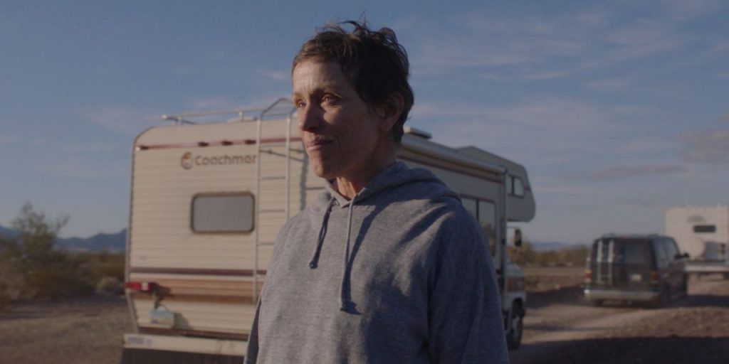 Dai freddi panorami del Nevada, stato con scorci meno noti rispetto agli agglomerati urbani ma altrettanto onirici, si muove Fern, vedova che a sessant’anni decide di riscrivere la sua esistenza, o almeno di allontanarsi dalla ‘città azienda’ di Empire, forma urbana diffusa nei paesi anglosassoni e letteralmente di proprietà di una società, nella quale ha vissuto per decine di anni assieme al marito. Passando da un McJob all’altro: dalla logistica di Amazon, alla raccolta delle barbabietole, dalla vendita di minerali, al lavoro nei fast-food, Fern rappresenta la più classica delle voci fuori dal coro, desiderosa di riaffermare la propria identità seguendo la meno consueta delle scelte comuni. Cercando attraverso una vita nomade, nel corso della quale s’imbatte in decine di persone, fra cui il ‘nomade’ David Strathairn, che come lei hanno deciso di vivere errando per le pianure e i deserti degli States, alla ricerca di una nuova esistenza, lontana e differente da chi pianta radici e cerca conferme.