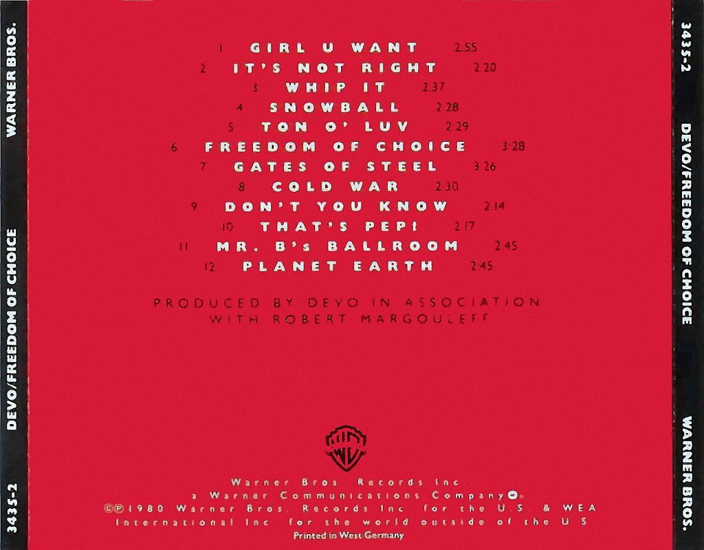 “Freedom Of Choice” mostra quale sarà la sua essenza già con l’iniziale Girl U Want: l’ossessività diventa tormentone, la protesta sarcastica si arena nelle languide maglie di una canzone d’amore. Con Whip It si passa direttamente alla multimedialità commerciale, quella dei videoclip, intuizione che tornerà utile l’anno dopo, quando proprio la Warner lancerà il canale televisivo Mtv. Ci sono poi buone e doverose evoluzioni del sound precedente, su tutte It’s Not Right e Ton O’ Luv, qualche scelta stilistica ambiziosa (Freedom Of Choice), alcuni brani che si discostano notevolmente dai vecchi Devo – ad esempio Snowball – ma parliamo pur sempre del lato A. Il retro somiglia ad una lenta agonia. Pezzi a tratti impersonali e indistinguibili, pochi momenti timidamente sferzanti (That’s Pep!) e un lento scivolamento verso la fine.