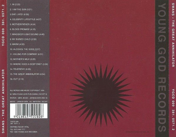 A Michael Gira mancavano solo due anni per staccare la spina agli Swans quando pubblica “The Great Annihilator“ nel 1995. “Swans Are Dead“, come recita il loro ultimo album, Gira e Jarboe pongono fine alla loro storia sentimentale e musicale, l’ultimo canto del cigno.