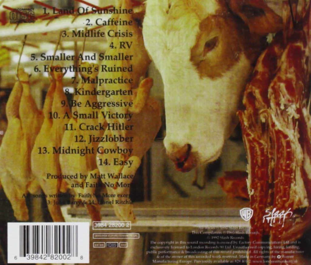 È qui che Patton dà vita al metodo che lo ha seguito per molti anni a venire, quello di mettere assieme le parole a seconda di quanto suonassero bene una in fila all’altra, drenando ogni senso dai brani, pur incarnando una marea di personaggi. Pensavo fosse nei Mr. Bungle che Mike indossasse più panni dei suoi soli, invece fu qui e si sente. Folle e disturbato, si toglie il sonno per scrivere Caffeine, pensa a quanto volesse vincere tutte le competizioni da ragazzino rendendosi conto di non poterlo fare (very americano, chissà quanto vero) per A Small Victory, lo humor nero che permea Crack Hitler, che fa persino ghignare Billy Gould il quale non si capacita di come un album platinato possa contenere un pezzo che parla di uno spacciatore di crack di colore che si crede il Fuhrer. O ancora Malpratice, con tutta la sua verve death metal sia verbale che sonora (i FNM furono visti indossare t-shirt dei Carcass e non a caso scrissero un pezzo su una tizia che adora essere operata da un chirurgo), per poi vederla rifatta quando il cantante fronteggiava il pubblico assieme ai Dillinger Escape Plan come chiusura di un cerchio, oltre la scopiazzatura che tutti ben sentite nel coro di cheerleader di Be Obscene di un certo Marilyn Manson. Midlife Crisis (un tempo conosciuta come Madonna) oggi non passerebbe il “non-offensive detector” e verrebbe massacrata al volo.