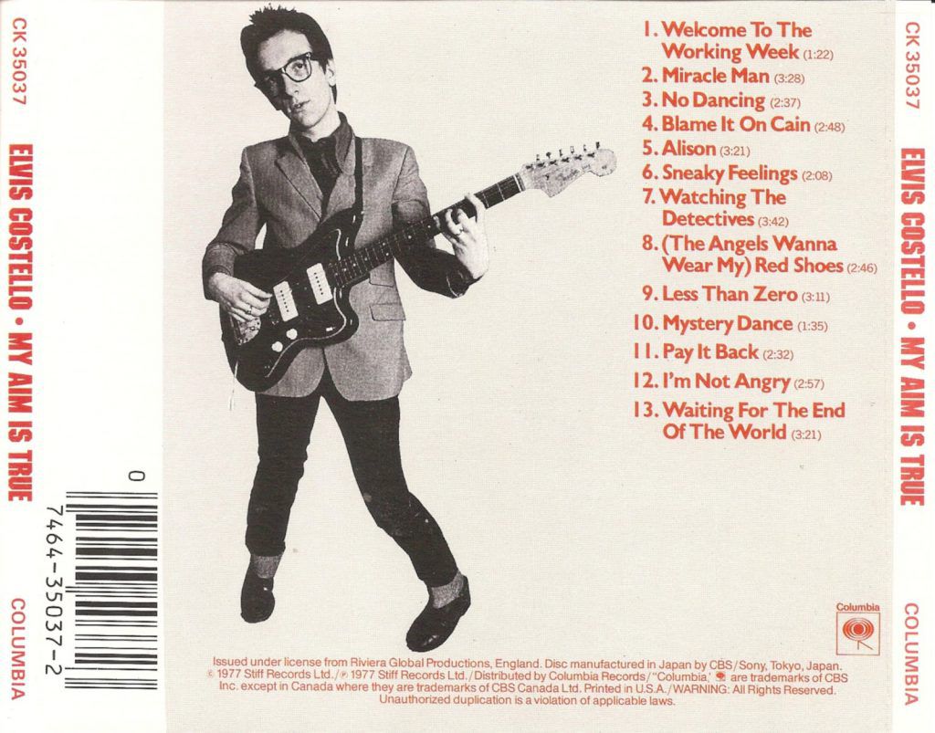 Il senso melodico di “My Aim Is True” diluiva appena le nevrosi di un giovanotto in piena tempesta emotiva, fra inganni e amarezza, frustrazione sessuale e tirate in odor di misoginia. Le bordate più fragorose erano per il leader dei fascisti inglesi Oswald Mosley, e stavano dentro il primo singolo, Less Than Zero, la canzone che ossessionò Bret Easton Ellis che poi ne prese in prestito il titolo per il suo primo romanzo. Il juke-box di “My Aim Is True” si apriva coi due minuti scarsi della vertiginosa Welcome to the Working Week, una parabola di allusioni, cinismo e giochi di parole: ”… ora che la tua foto è sul giornale , viene ritmicamente ammirata…”.