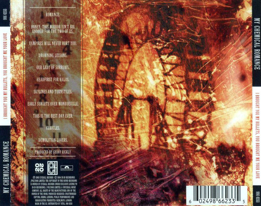 Un punk rock vitale, grezzo e genuino, che purtroppo (o per fortuna) è andato perso nei successivi lavori della band, tanto da far sì che l’ascolto di “I Brought You My Bullets, You Brought Me Your Love” non possa non suscitare una certa nostalgia. Il gruppo dei dischi successivi (un esempio su tutti, “The Black Parade” ha visto snaturare per buona parte il loro sound originale dei primi due album), infatti, sembra completamente un’altra band. Nell’album d’esordio, infatti, i My Chemical Romance erano ruvidi e arrabbiati; alti melodici si alternavano a bassi urlati, e il tutto veniva tenuto insieme da chitarre prepotenti e cupe note di basso. Certamente un disco da ascoltare se si vuole conoscere la band degli esordi ancora incontaminati dal music-business. “I Brought You My Bullets, You Brought Me Your Love” era soltanto il primo passo di un gruppo ancora acerbo e poco consapevole delle proprie potenzialità, di una band che qualche anno dopo avrebbe saputo conquistare pubblico, critica e media.