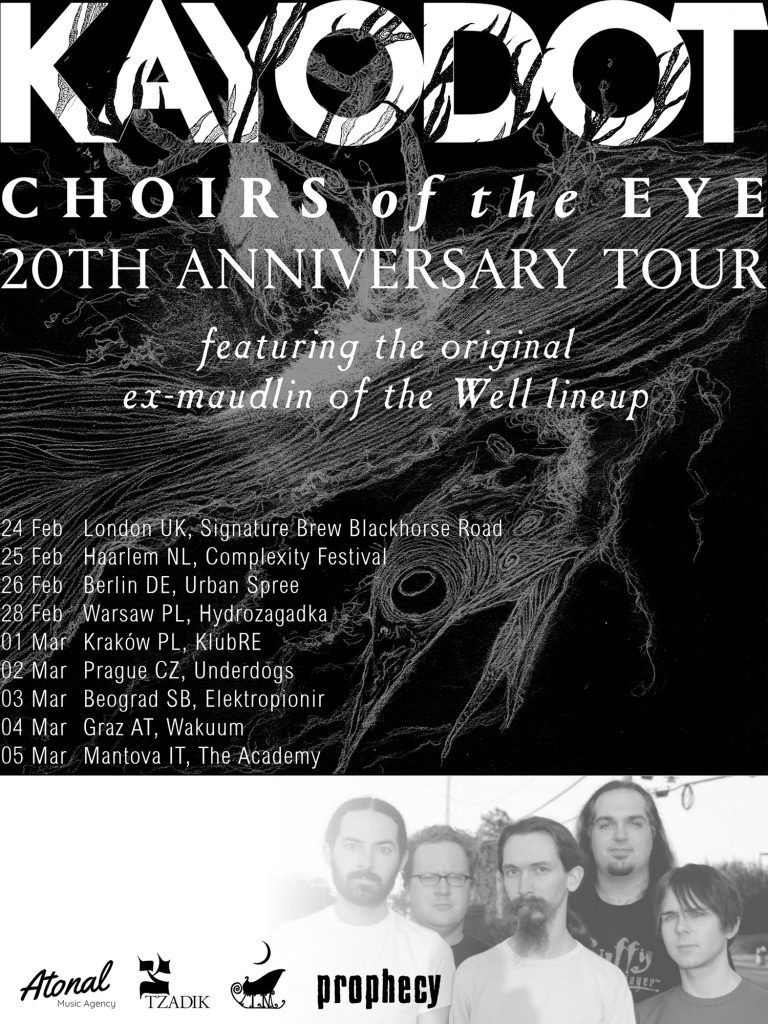I Kayo Dot stanno per imbarcarsi nel loro tour europeo dedicato al ventennale dell’uscita dell’album di debutto (pubblicato dalla Tzadik di John Zorn) “Choirs In The Eye” e lo faranno con la line-up dei Maudlin Of The Well al completo. È prevista anche una data in Italia che si terrà il 5 marzo al The Academy di Mantova accompagnati dai Juggernaut (qui l’evento Facebook del concerto).