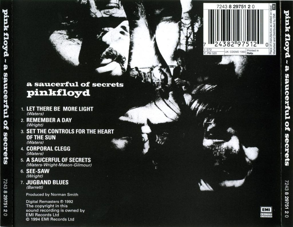 Con See Saw si torna tutto d’un colpo alle battute iniziali del disco, che però è il preludio alla fine. Che non è solo la conclusione del disco: Jugband Blues è il testamento di Syd, il suo addio alla band prima di intraprendere la strada senza ritorno che lo porterà ben presto in un’altra dimensione, la sua, il pianeta del diamante pazzo narrato nei dischi successivi. “Saucerful” è quindi l’embrione dei nuovi Pink Floyd, il primo passo verso la leggenda conosciuta in tutto il mondo. Perché dopo alcuni tentativi con le colonne sonore (“More” e “Zabriskie Point”) e dopo un ambizioso album dal vivo (“Ummagumma”), l’anima dei Pink Floyd verrà definitivamente incarnata dal genio di Roger Waters e dalla melodia di David Gilmour, dai sentieri tracciati da Richard Wright e dai tempi scanditi da Nick Mason. Non più, quindi, una divinità e i suoi adepti, bensì quattro menti diverse che danno vita ad un unico suono.