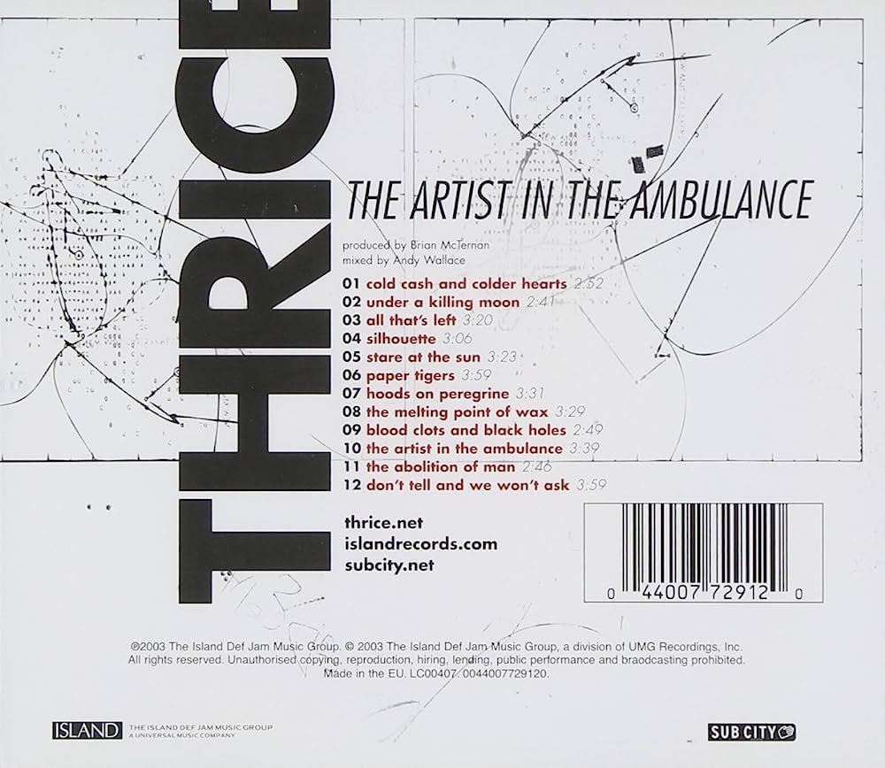 Si può considerare “The Artist in the Ambulance” un lavoro di transizione e di evoluzione della band, poiché i nostri, album dopo album, si avvicineranno sempre di più ad un alternative rock più concentrato su introspezione e riflessione piuttosto che sull’aggressività del rock tradizionale e del post-hc in genere. Da molti considerato il capolavoro della loro discografia, la critica fu invece più tiepida: già dai primi singoli pubblicati in anteprima, lo spazio riservato dai media fu ristretto, motivo per cui i Thrice decisero di rivolgere tutti i propri sforzi sul fronte dei live, imbarcandosi in un lungo tour nell’autunno dello stesso anno con Thursday e Coheed And Cambria, registrando il tutto esaurito negli Stati Uniti.