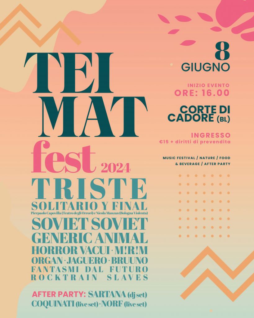 La line up: il Teimat Fest vanta una line up che celebra la diversità e l’innovazione della musica alternativa italiana. Tra i nomi figurano Triste Solitario Y Final (Pierpaolo Capovilla del Teatro degli Orrori e Nicola Manzan di Bologna Violenta), Soviet Soviet, Generic Animal, Horror Vacui, M!R!M!, Organ, Jaguero, Bruuno, Fantasmi del Futuro e Rocktrain Slaves.