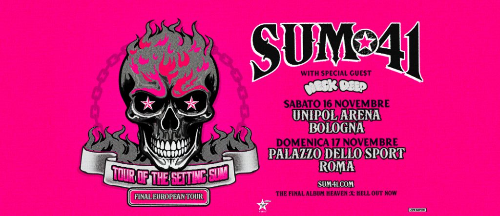 I Sum 41 hanno annunciato due nuove date italiane che faranno parte del “Tour of the Setting Sum”, il loro tour di addio, fissate per sabato 16 novembre 2024 all’Unipol Arena di Bologna e domenica 17 novembre 2024 al Palazzo Dello Sport di Roma. La band canadese è inoltre headliner ad I-Days Milano Coca-Cola per la data sold-out del 9 luglio 2024 all’Ippodromo Snai San Siro. Saranno le ultime occasioni per vedere dal vivo i Sum 41.