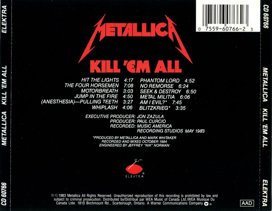 Per parlare dei brani, The Four Horsemen, Jump In the Fire, Phantom Lord e Metal Militia furono composti da Dave Mustaine e Ron McGovney, ma poi il tutto fu leggermente riscritto e riadattato per Hammett e Burton quando entrarono stabilmente nei Metallica. “Kill ‘Em All“, alla sua uscita, sarà l’album che inventerà e, per certi versi, totalizzerà il genere, estremizzando ancora di più quello che l’heavy metal ancora non aveva fatto. La voce di James Hetfield sarà una delle più imitate e abusate negli anni successivi del genere.