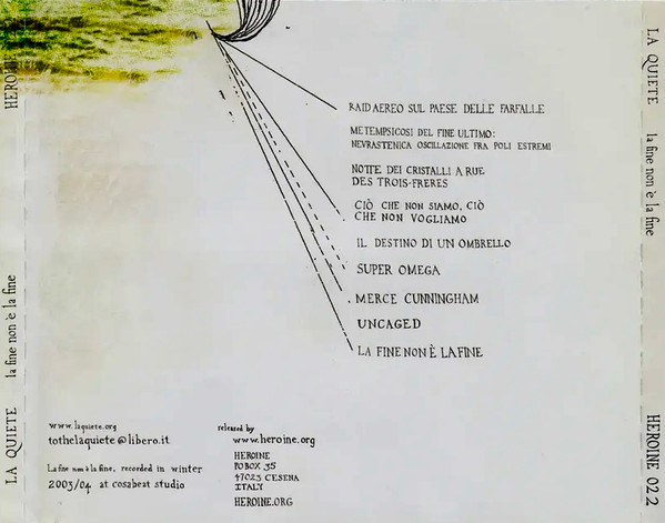 Riguardo, a vent’anni di distanza, le foto dei La Quiete di quanto uscì “La fine non è la fine”. In studio, in tour, ai concerti. In alcuni scatti ci sono anche io, alle volte mi ci sono ritrovato. Non eravamo tanto diversi, tra di noi. I vestiti, le magliette, i corpi esili e senza barbe. Ci siamo fermati al 1994, ripetendo le nostre azioni in luoghi diversi e al cospetto di persone differenti. È come se, col passare del tempo, ci fossimo mimetizzati, grazie a questo disco. È stato il primo disco che abbiamo sentito vicino, che abbiamo cantato a squarciagola, nonostante la nostra timidezza, la nostra mancanza di carattere ed il pudore di chi è cresciuto in un’epoca in cui bastava affidarsi alla scienza ed al progresso per poter risolvere i propri problemi. Cantavamo quel ritornello che abbiamo aspettato per tutta la nostra infanzia ma che nessuno, sino a quel momento, ci aveva potuto insegnare. I ragazzi sono rimasti ragazzi, e questo è stato il loro primo e unico disco per intero in un labirinto di canzoni, amicizie, cambiamenti, verbosità. Tra ripubblicazioni in altri Paesi, tra diversi formati, per giradischi e mangiacassette. L’unico album in studio che le statistiche possano chiamare tale.