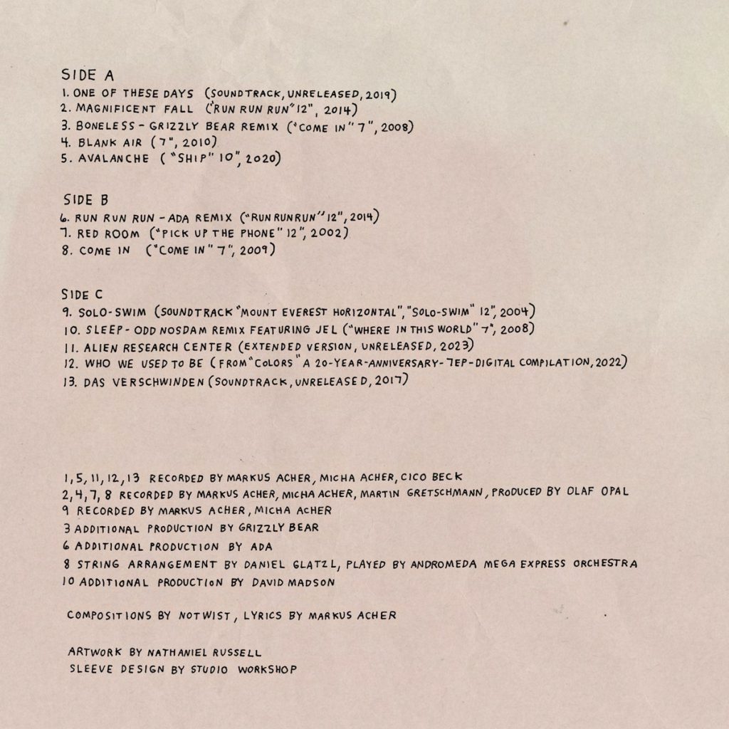 Il finale raccoglie il senso dell’intero progetto. Who We Used To Be riflette sulla distanza tra ciò che si è stati e ciò che si è diventati, mentre Das Verschwinden – La scomparsa – chiude tutto in evaporazione, lasciando un’eco più che una risposta. È in questa dissolvenza che i Notwist chiariscono l’intento della raccolta: rimettere in circolo il passato, mostrando le crepe con cui il tempo ha solcato la vita, e la luce che ancora le attraversa.