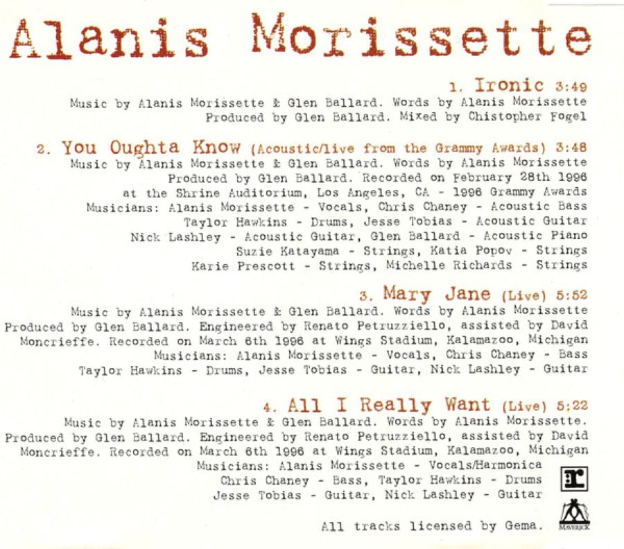 All’interno dell’album “Jagged Little Pill“, Ironic si colloca come un passaggio cruciale del disco, un momento di respiro dopo una serie di canzoni intense e cariche di emozioni contrastanti. Mentre gran parte del disco è dominata da sentimenti forti come rabbia, delusione e desiderio di riscatto, questo brano si sposta su un piano più riflessivo, offrendo una visione più ampia della vita e delle sue contraddizioni.